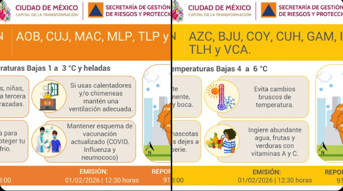 Asimismo, se activó Alerta Amarilla por pronóstico de temperaturas bajas en las demarcaciones Azcapotzalco, Benito Juárez, Coyoacán, Cuauhtémoc, Gustavo A. Madero, Iztacalco, Iztapalapa, Miguel Hidalgo, Tláhuac y Venustiano Carranza.