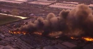 Una cadena de televisión transmitió un video en el que se podía ver enorme sendero de llamas y una columna de humo que se extendía desde un estacionamiento mientras los camiones de bomberos intentaban apagar el fuego.