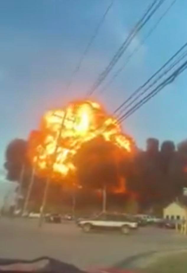 Una cadena de televisión transmitió un video en el que se podía ver enorme sendero de llamas y una columna de humo que se extendía desde un estacionamiento mientras los camiones de bomberos intentaban apagar el fuego.