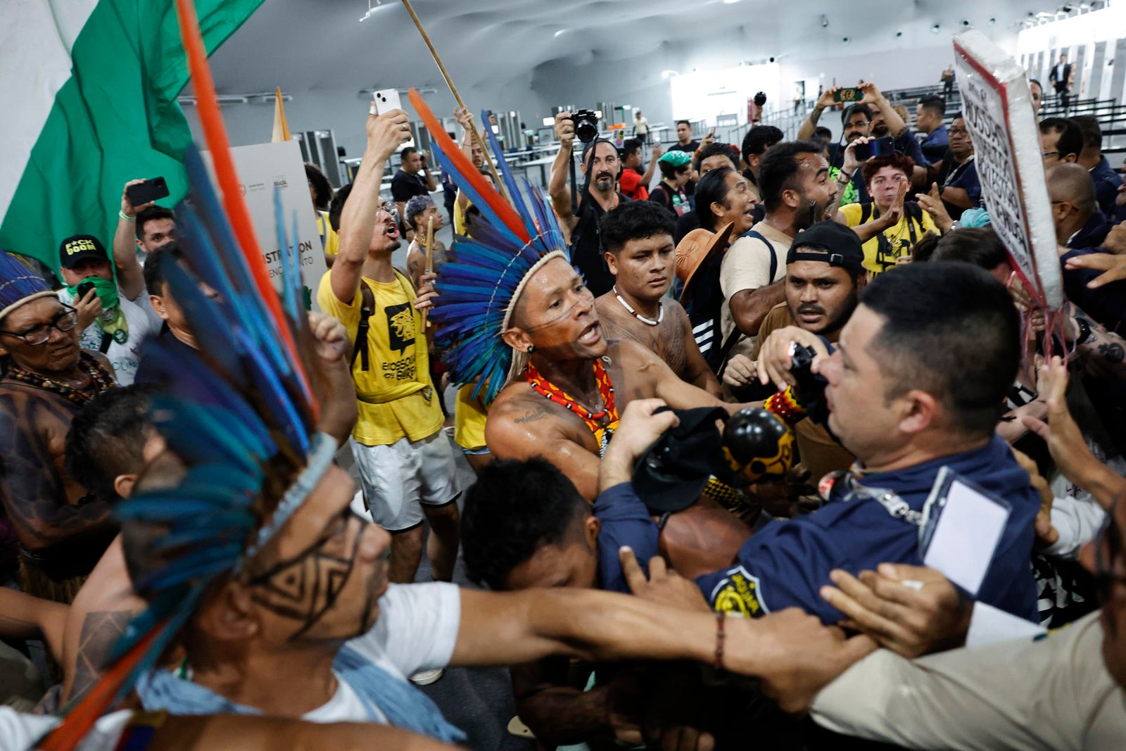 Afuera, dos buques de la armada brasileña escoltaron una flotilla de protesta que transportaba a líderes indígenas y activistas ambientales alrededor de la bahía de La Guajara en Belém.