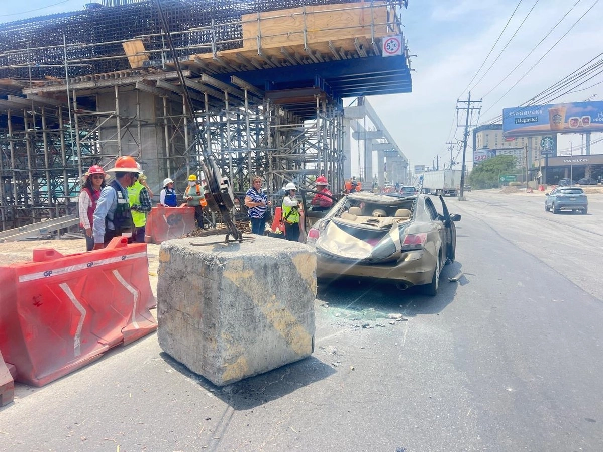 Apodaca, Nuevo León.- Una persona resultó lesionada luego de que un cubo de concreto perteneciente a las construcciones de la Línea 6 del Metro de Nuevo León, le cayera a su automóvil mientras transitaba cerca de las obras.