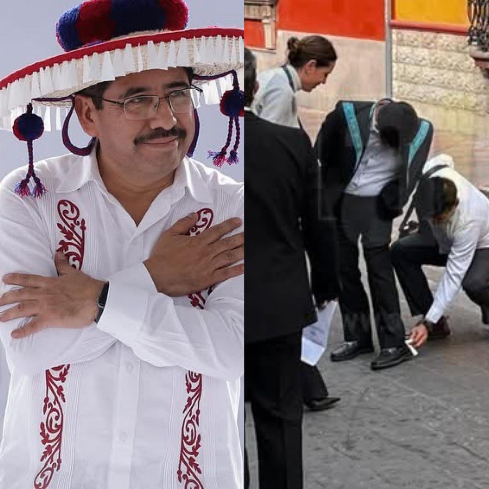 En las imágenes se puede observar cómo una mujer con un pañuelo blanco se agacha para limpiar el zapato de Aguilar Ortiz.