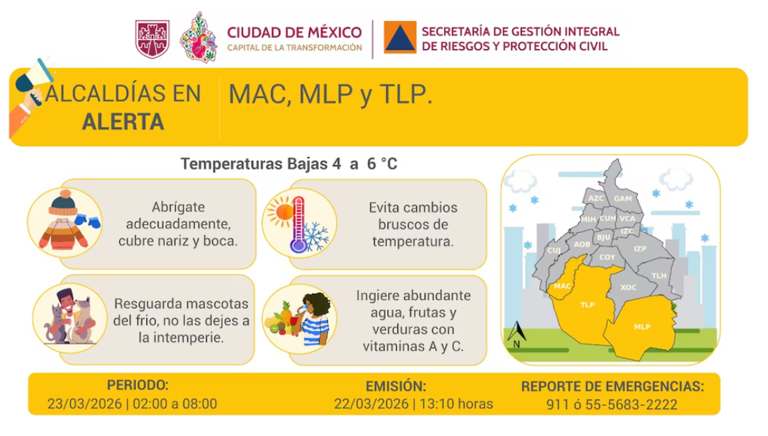 También resulta fundamental seguir las indicaciones y recomendaciones de la dependencia capitalina por las bajas temperaturas previstas para este lunes 23 de marzo en la alcaldía antes mencionadas.