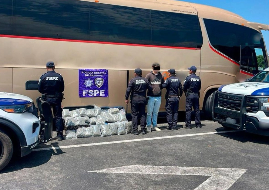 Relató que los oficiales revisaron dos maletas que olían a mariguana y en su interior encontraron 44 bolsas de plástico con el enervante. La Secretaría precisó que la droga asegurada equivale a 23 mil 170 dosis.