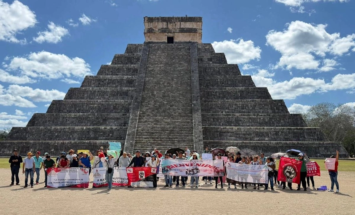 Irrumpe CNTE en Chichén Itzá y protesta por pensiones frente al templo de Kukulcán