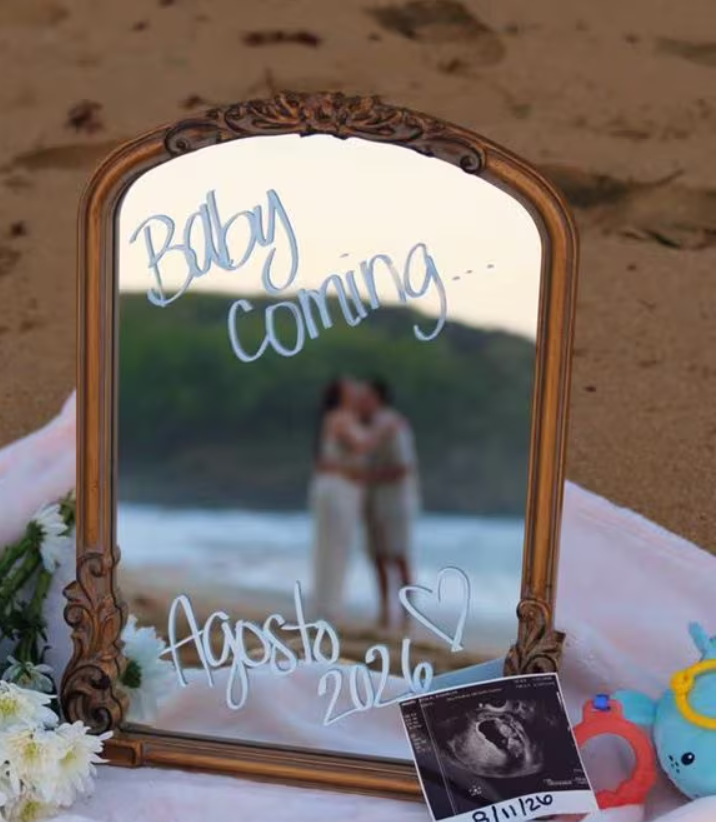 Un mensaje escrito en un espejo sobre la arena de la playa anuncia la nueva etapa que Jesselys, hija de Daddy Yankee, está por vivir: “Baby coming… agosto 2026”. La joven celebra la llegada de su primer hijo junto a Carlos Olmo, con quien contrajo matrimonio en octubre de 2025.