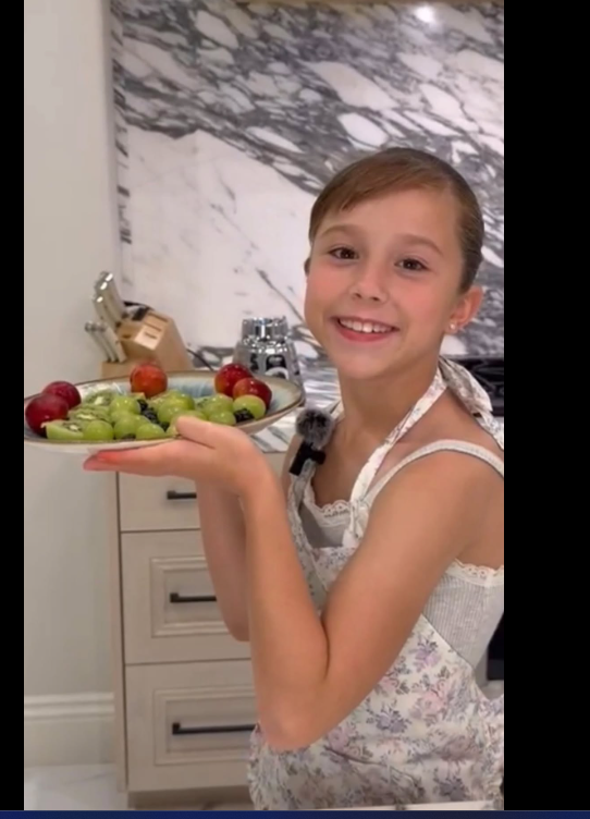 “Hola, acompáñenme a hacerle una ensalada de frutas a mi papá”, comienza el video de María Fernanda, quien después enlista los ingredientes que ocupará para su receta: mini plums, blueberries, dos kiwis y uvas.