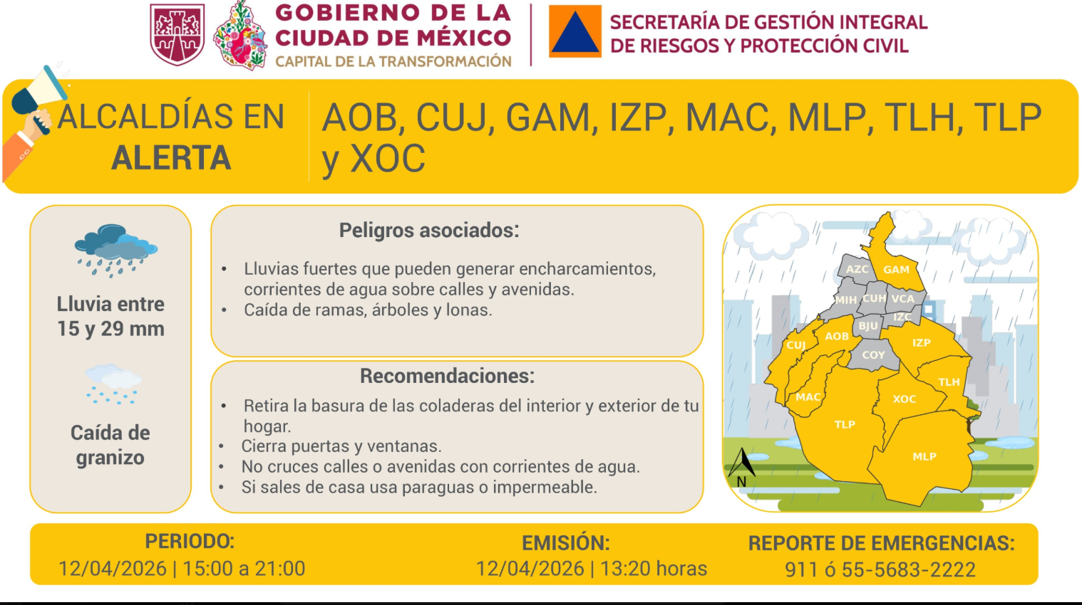 Por la tarde, en la CDMX la estimación máxima de temperatura es de 24 a 26 °C, mientras que Toluca podrá alcanzar los 19 a 21 °C. En ambas entidades se prevén lluvias y chubascos con posibles descargas eléctricas, mientras hay probabilidad de caída de granizo.
