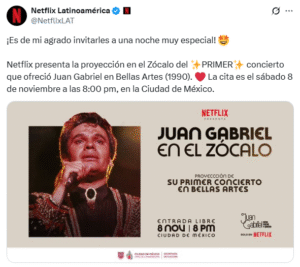 Netflix presenta la proyección en el Zócalo del primer concierto que ofreció el divo de Juárez “Juan Gabriel” en Bellas Artes (1990).