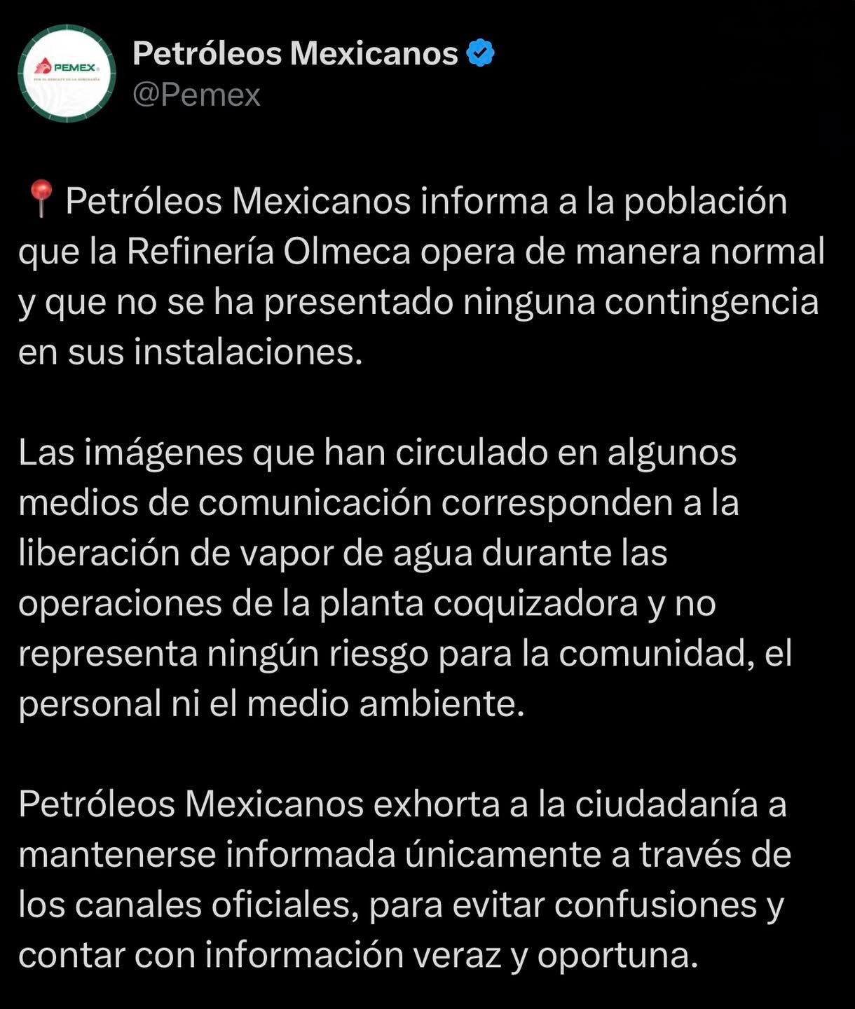 ”Petróleos mexicanos informa a la población que la refinería Olmeca opera de manera normal y que no se ha presentado ninguna contingencia en sus instalaciones.