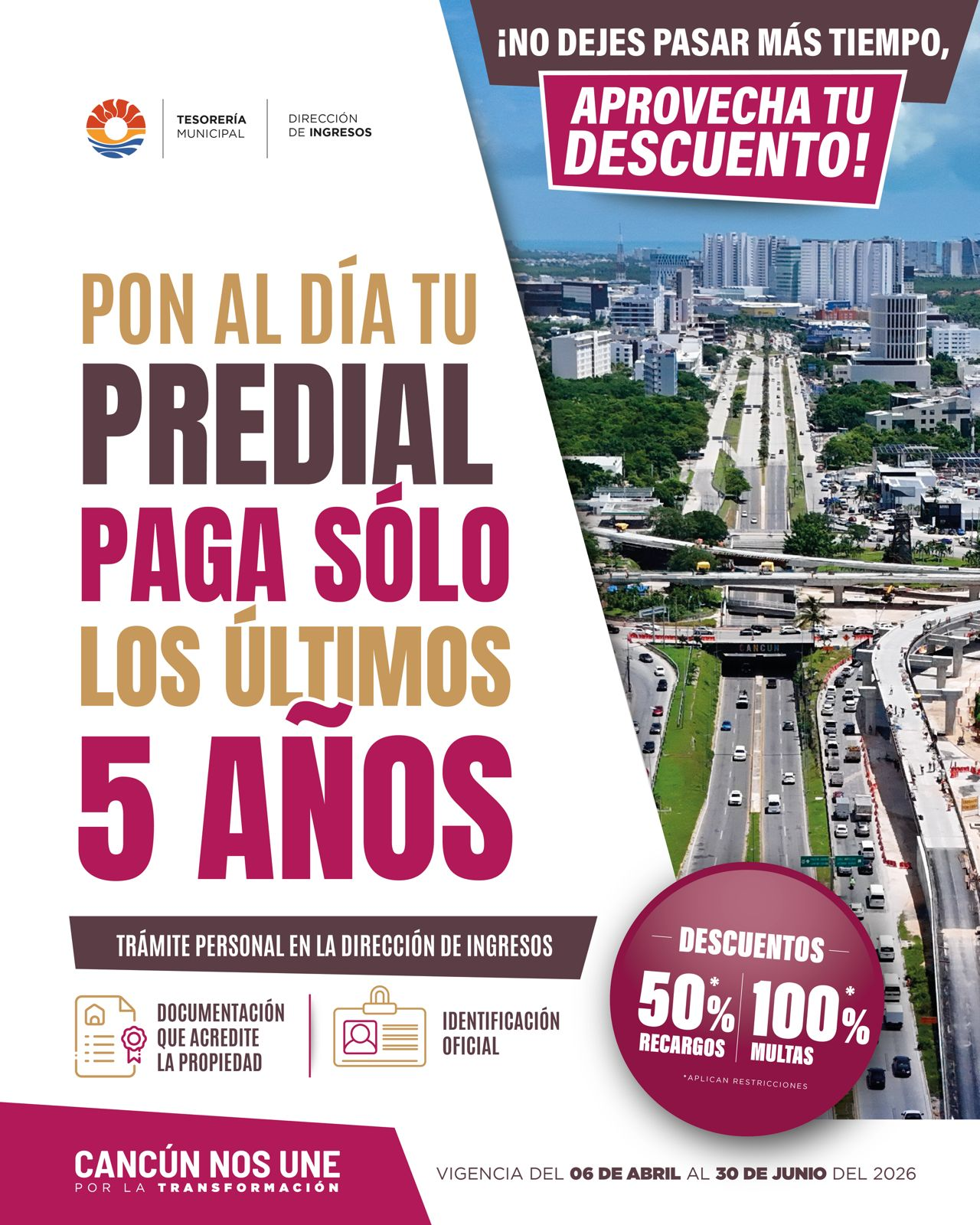 Ana Paty Peralta exhortó a los habitantes a que acudan a la Dirección de Ingresos  o a las jornadas itinerantes semanales del programa “Día del Pueblo. Cancún nos une por la transformación”, ya sea en el Palacio Municipal o en algún domo en diferentes puntos de la ciudad, en donde también se instala un módulo de atención de dicha dependencia para que los orienten sobre el procedimiento y el monto a liquidar, lo que dependerá del valor catastral del predio.