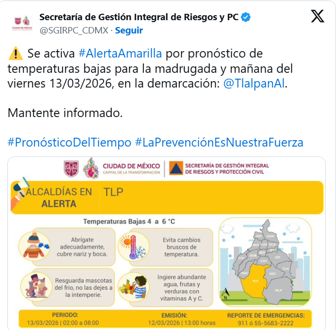 - Temperatura mínima estimada en la Ciudad de México: 7 a 9 °C.