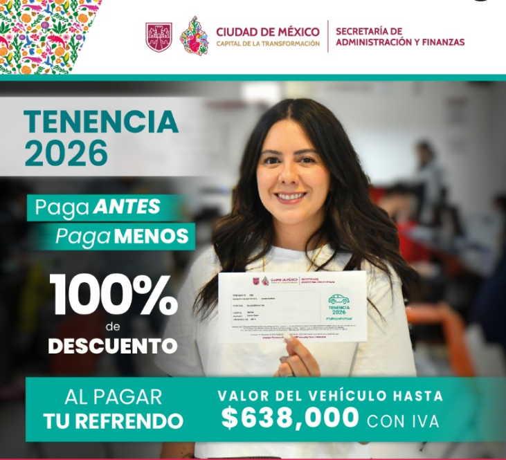 La Secretaría de Administración y Finanzas (SAF) dio a conocer que, una vez cubierto el pago correspondiente al refrendo, que este 2026 es de 760 pesos, se otorgará un descuento del 100% de la tenencia vehicular en automóviles cuyo valor total, incluido el Impuesto al Valor Agregado (IVA), no exceda de 638 mil pesos.