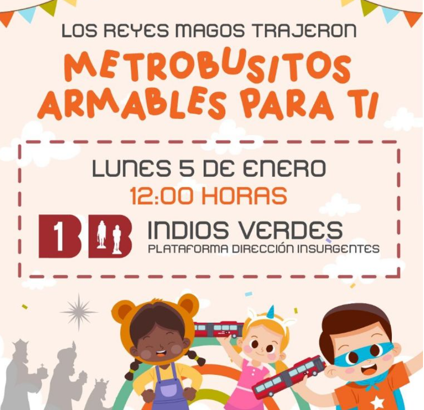 De acuerdo con el medio de transporte, los “metrobusitos” armables se entregarán este lunes 5 de enero de 2026, a las 12:00 horas, en la estación Indios Verdes de la Línea 1, en la plataforma dirección Insurgentes.