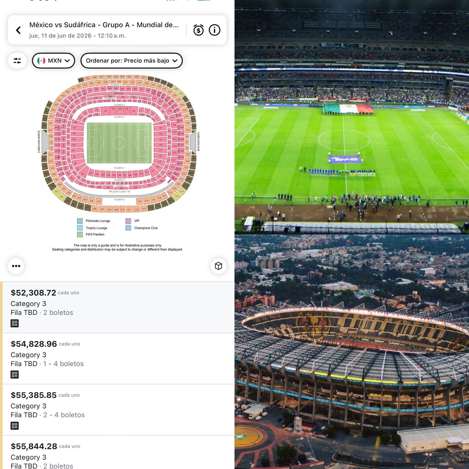 Los precios de las entradas para el juego inaugural del Mundial el 11 de junio en el estadio Azteca, (recién nombrado Banorte) entre México y Sudáfrica también se elevó hasta los 800 mil pesos cuando el precio inicial había sido de mil 825 dólares (33 mil pesos).