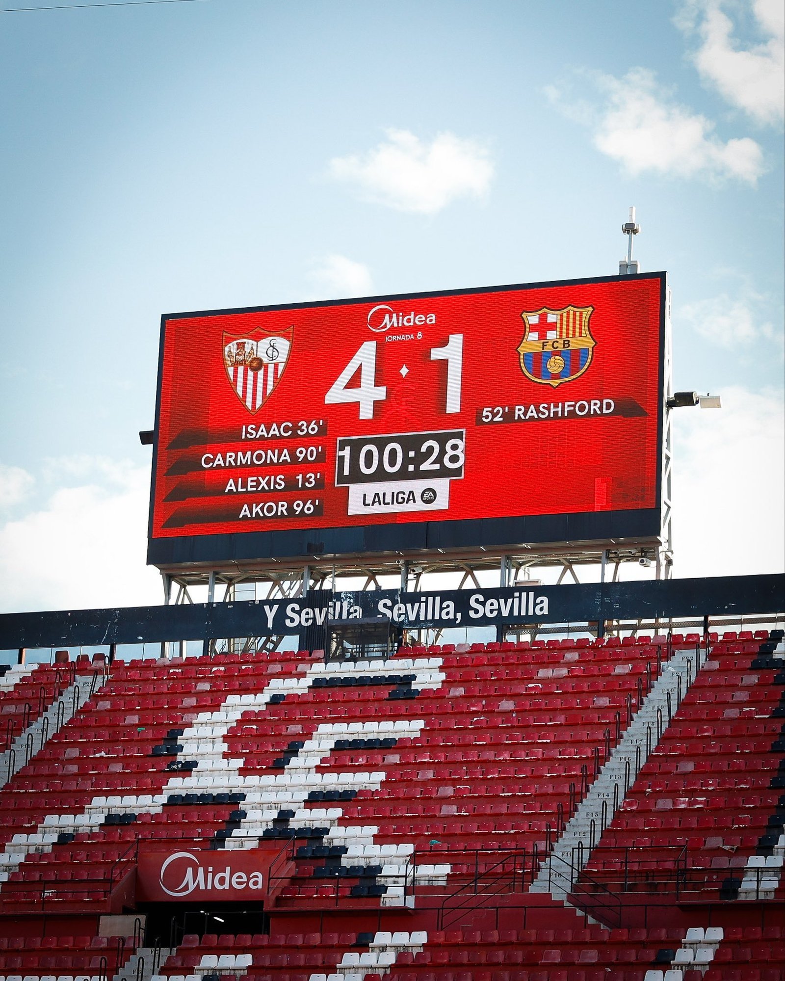 El club de fútbol Sevilla goleo este domingo 5 de octubre al club de fútbol Barcelona 4-1, con goles de Alexis al minuto 13, Isaac al 36, Carmona al 90 y Akor al 98 por parte del equipo de Sevilla y por parte del Barcelona solo tuvo una anotación de Rashford al minuto 52.