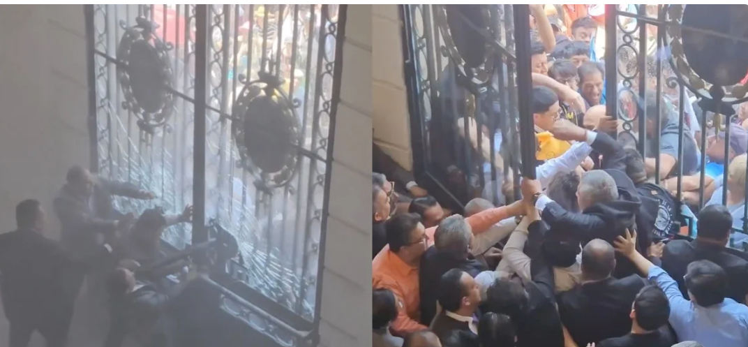 En redes sociales circulan algunos videos donde se puede apreciar el momento en que los manifestantes, entre gritos y empujones, intentan abrir por la fuerza las puertas mientras elementos de seguridad tratan de impedirlo valiéndose, incluso, del uso de extintores para repeler las agresiones.