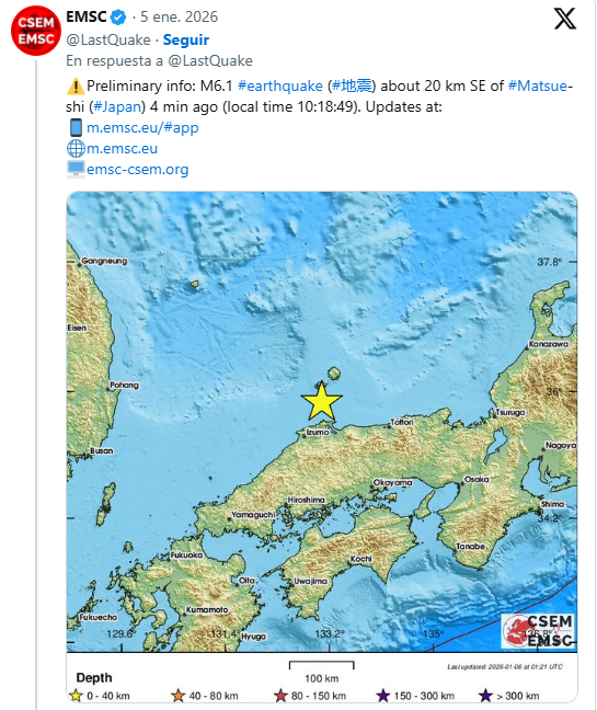 En Japón registraron un terremoto de 6.2 en escala de richter de acuerdo con el Servicio Meteorológico local, tras este movimiento se registraron réplicas en menor escala dentro del epicentro en Matsue. Descartan riesgo de tsunami.