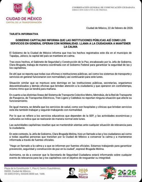 Aunado a ello, el Gabinete de Seguridad capitalino permanece en sesión continua y que se ha desplegado un operativo preventivo con respaldo de fuerzas federales.