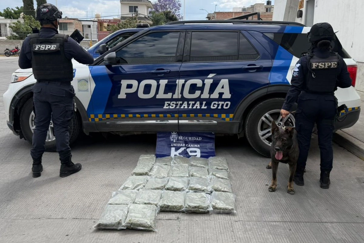 “El primer hecho fue en una empresa de paquetería ubicada en la central de autobuses de Irapuato, donde un ejemplar de la Unidad Canina K9 realizó un marcaje positivo sobre un paquete”, señaló.